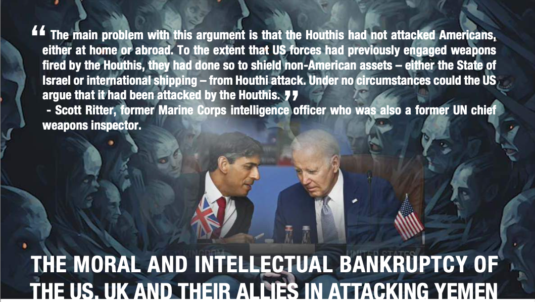 - By distancing itself from Operation Prosperity Guardian, the US has been stupid enough to fatally undermine any notion of pre-emptive collective self-defence under Article 51 of the UN Charter, thus highlighting the unilateral, and inherently illegal nature of its military attacks on Yemen.
