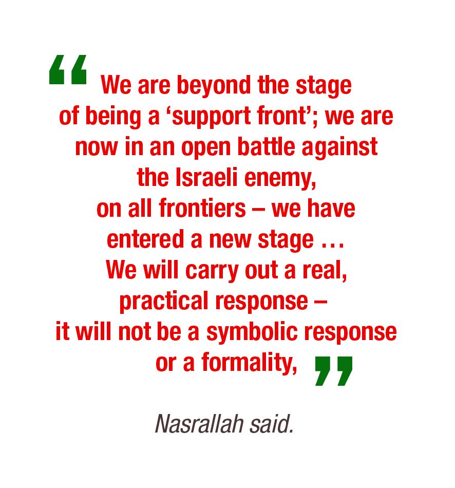 - “We are beyond the stage of being a ‘support front’; we are now in an open battle against the Israeli enemy, on all frontiers – we have entered a new stage … We will carry out a real, practical response – it will not be a symbolic response or a formality,” Nasrallah said.