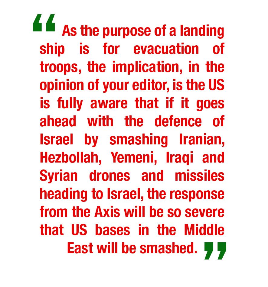 - As the purpose of a landing ship is for evacuation of troops, the implication, in the opinion of your editor, is the US is fully aware that if it goes ahead with the defence of Israel by smashing Iranian, Hezbollah, Yemeni, Iraqi and Syrian drones and missiles heading to Israel, the response from the Axis will be so severe that US bases in the Middle East will be smashed.