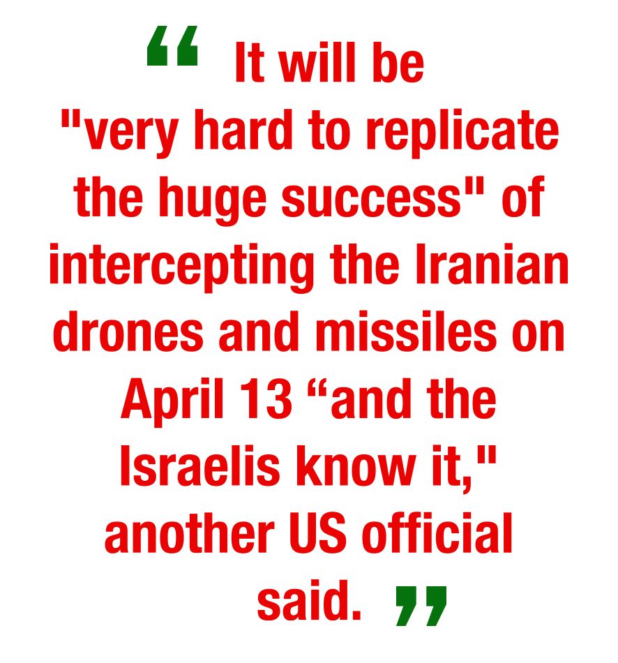 - It will be “very hard to replicate the huge success” of intercepting the Iranian drones and missiles on April 13 “and the Israelis know it,” another US official said.