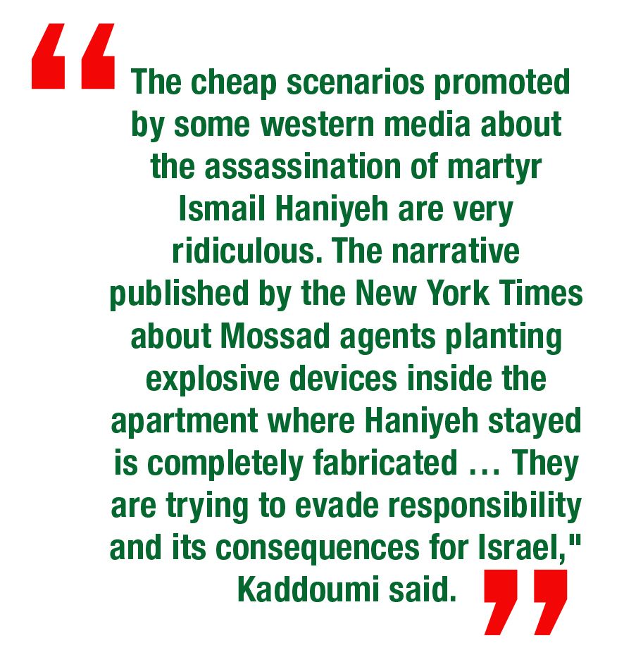 - “The cheap scenarios promoted by some western media about the assassination of martyr Ismail Haniyeh are very ridiculous. The narrative published by the New York Times about Mossad agents planting explosive devices inside the apartment where Haniyeh stayed is completely fabricated … They are trying to evade responsibility and its consequences for Israel,” Kaddoumi said.